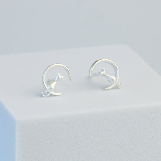 Cat and Crescent Moon Stud Earrings