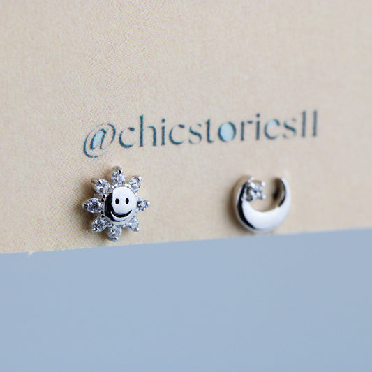 Tiny Crystal Sun and Moon Stud Earrings